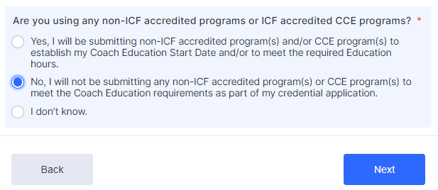 | Are you using any non-ICF accredited programs or ICF accredited CCE programs? | No, I will not be submitting and non-ICF accredited program(s) or CCE program(s) to meet the Coach Education requirements as part of my credential application. |