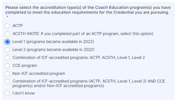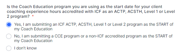 | Is the Coach Education program you are using as the start date for your client coaching experience hours accredited with the ICF as an ACTP, ACSTH, Level 1 or Level 2 program? | Yes, I am submitting an ICF an ACTP, ACSTH, Level 1 or Level 2 program as the START of my Coach Education. |